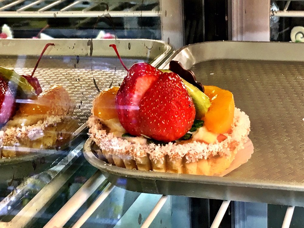 A moist, sweet cake soaked in three types of milk, garnished with fresh strawberries and sliced peaches, topped with whipped cream and a chocolate drizzle.