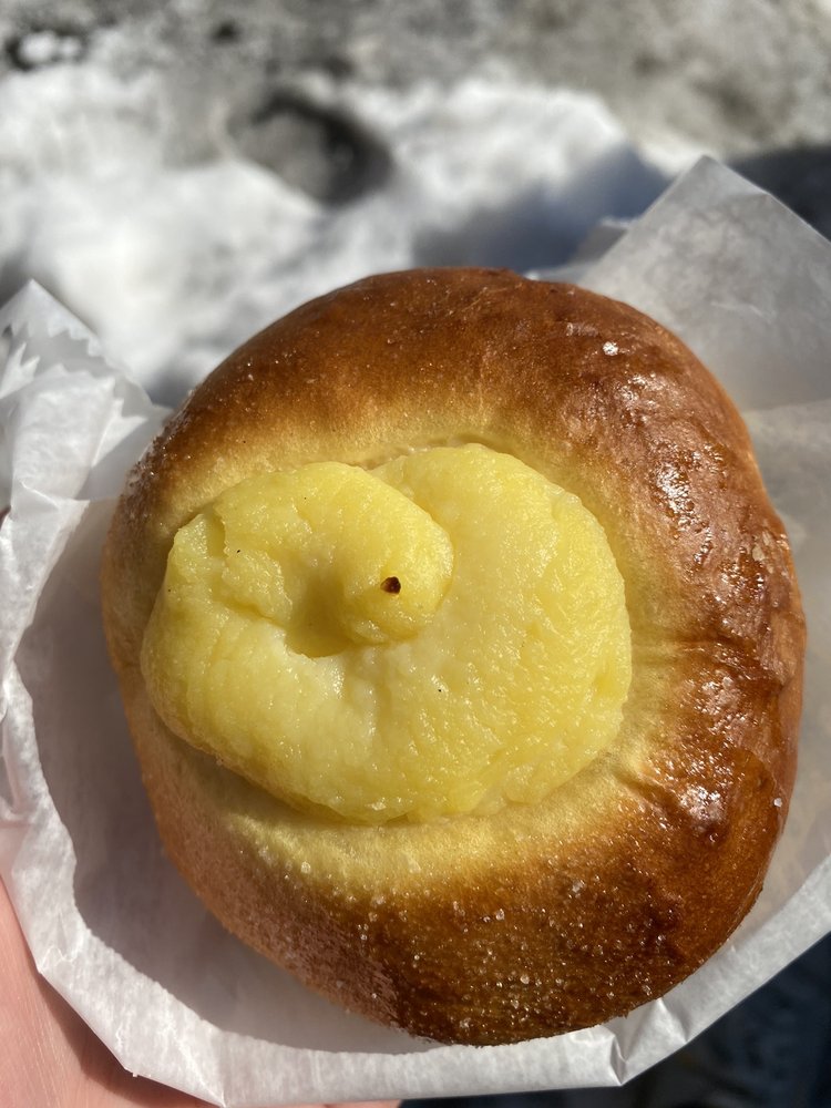 Golden-baked pastries filled with a sweet, creamy center, presented in pairs.